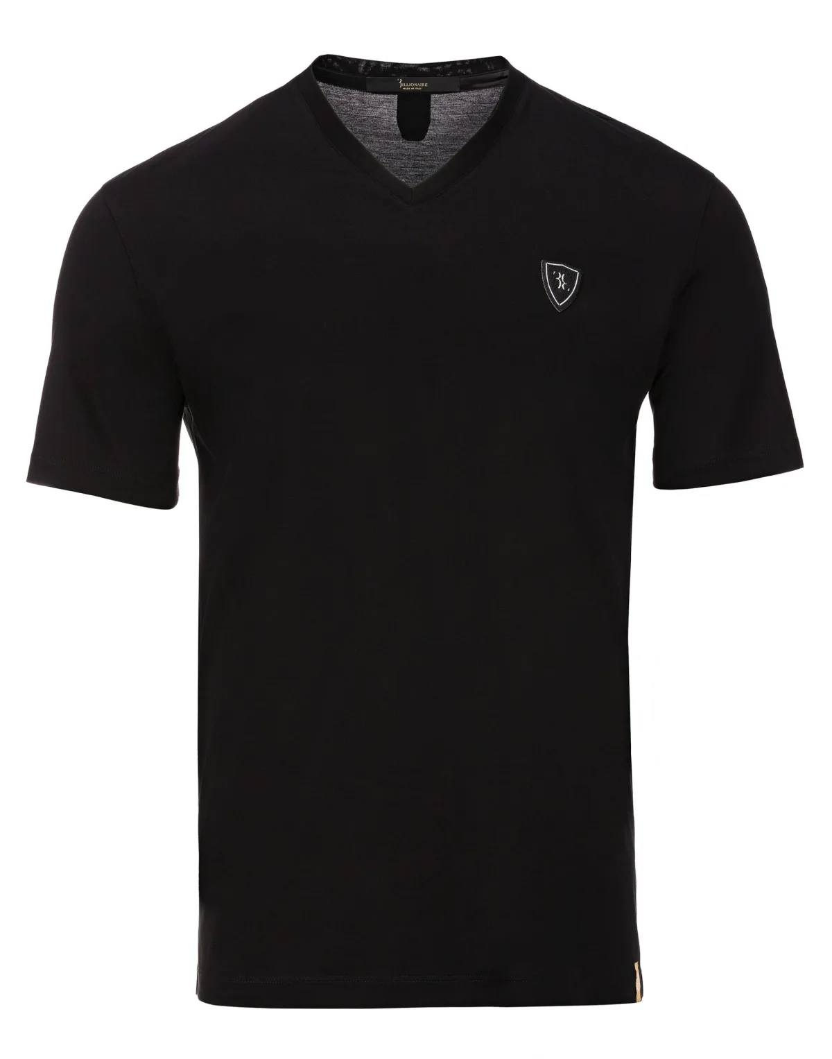 Mercerized cotton jersey V-neck t-shirt. Leather crest patched at left chest. Embroidered hang loop at the back yoke. Two side slits.