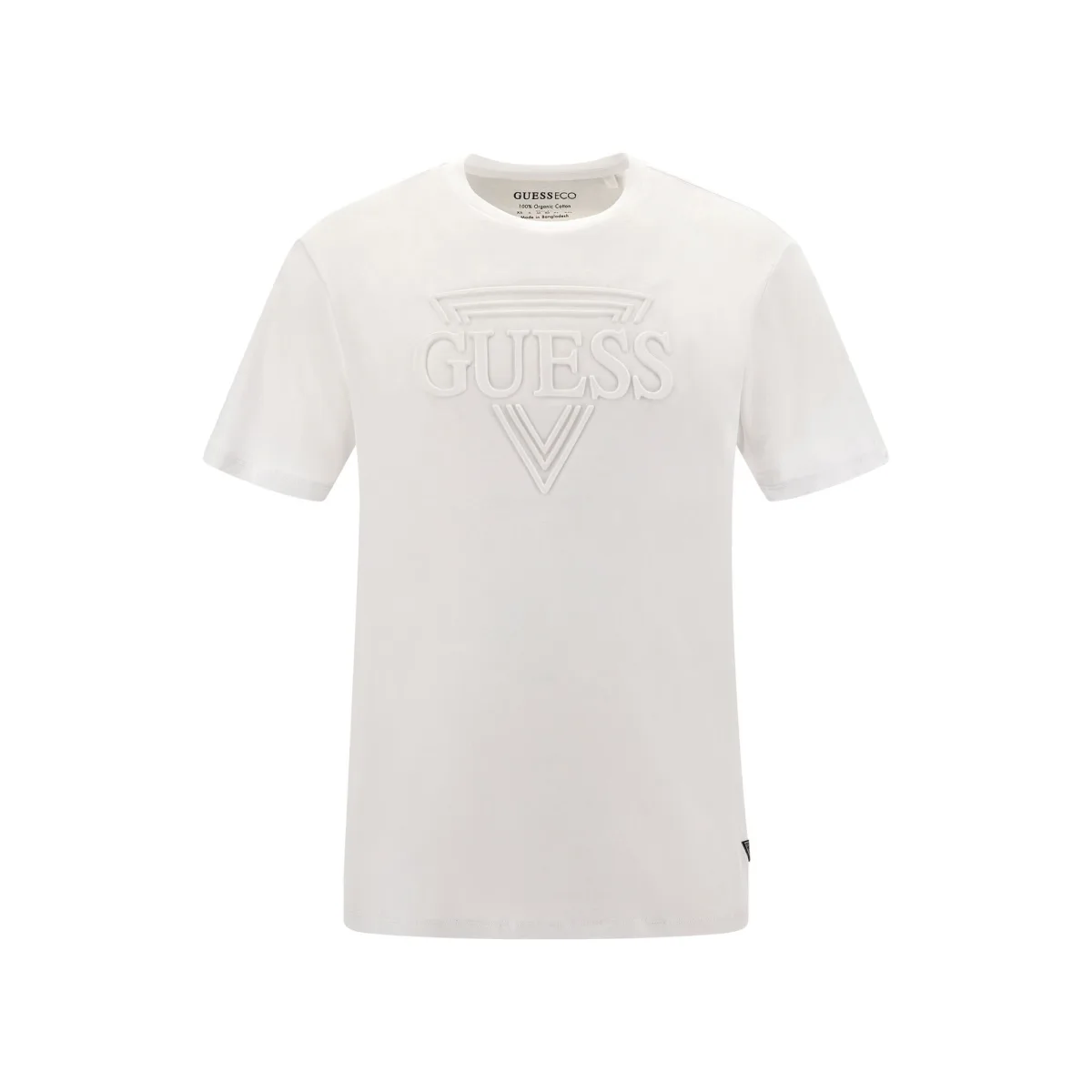 Guess T-shirt met reliëf voor heren, wit, synthetisch. Authentiek Guess-kledingstuk - streetwear/sportkleding design van Guess - Guess voor heren, perfect voor dagelijks gebruik - dit witte Guess T-shirt past perfect bij de rest van je garderobe - comfortabel synthetisch materiaal - klassiek - reliëf