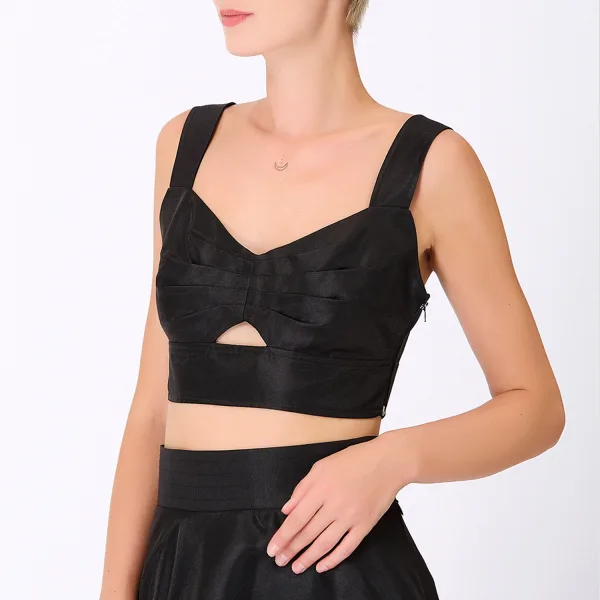 Harthals, plooien op de borst en brede riemen, dit zeer huidige stuk wordt grootgebracht door een brede ribband en een open werk driehoek onder de borst. Om te dragen met de gecoördineerde setrok en jas in dezelfde stof. Productdetails • Vorm: kort, gemonteerd • Lengte: 16 cm • hart halslijn