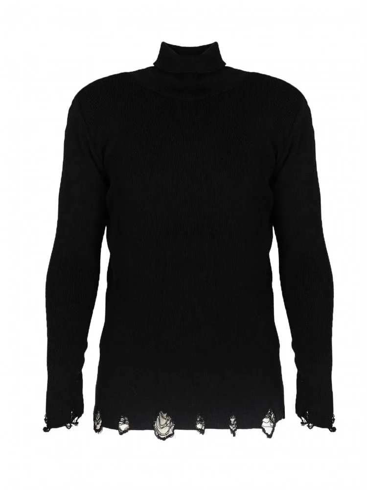 Eenvoudige snit Met rolkraag Mouwen en zoom opzettelijk gerafeld Bedrijfspatch op de linkerzoom Gemaakt van hoogwaardig gebreid materiaal Gemaakt in Italië