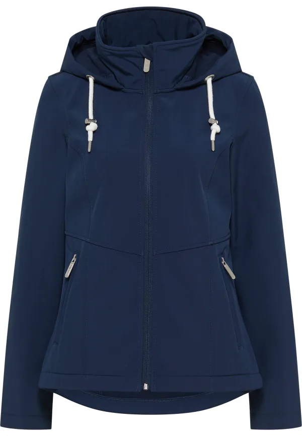 Het sportieve, licht getailleerde softshell jack maakt zijn claim van innovatieve outerwear meer dan waar. Het softshell-materiaal is wind- en waterdicht en heeft een zachte fleece binnenkant voor behaaglijke warmte. De grote, beschermende capuchon met trekkoord en stijlvol koord en de opstaande kraag helpen kou en wind buiten te houden. Drukknopen met logo-gravure, contrasterende oogjes en hoogwaardig logoborduursel zorgen voor een karakteristieke look. De chique overgangsjas wordt afgerond door de zijzakken met rits en de verlengde achterkant met afgeronde zoom.