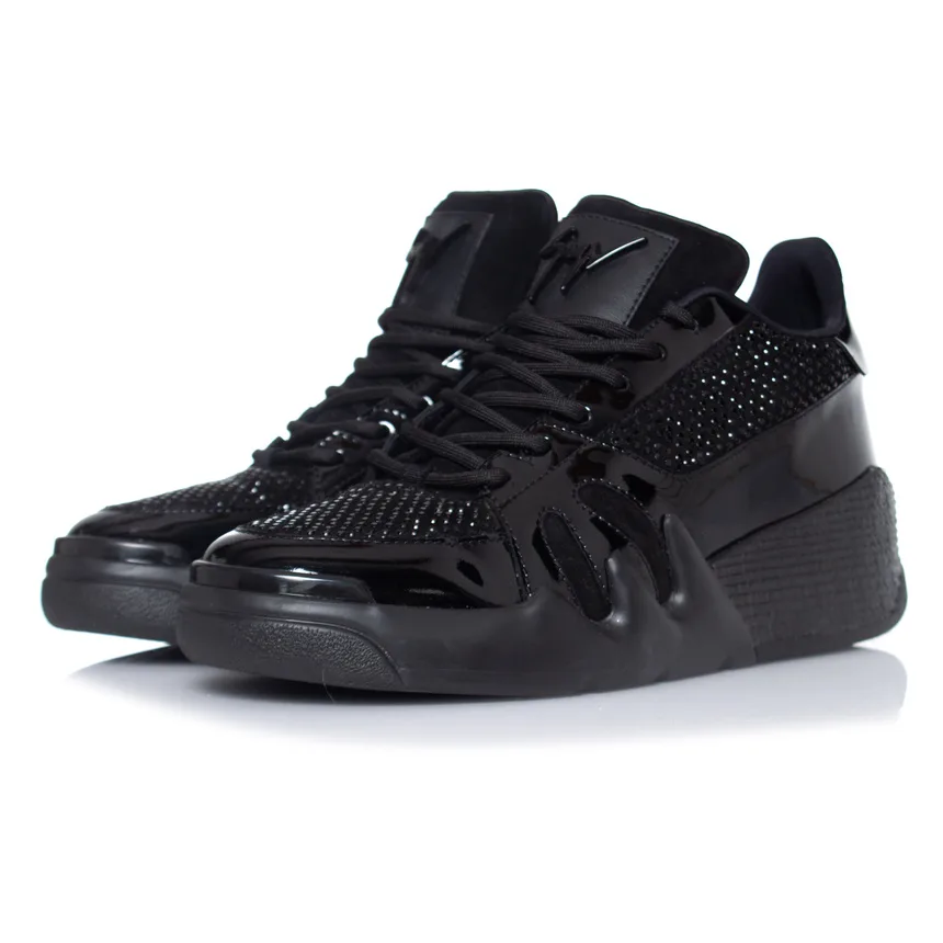 Giuseppe Zanotti, TALON zwarte sneakers met rhinestones. Het artikel is nieuw - ongebruikt en wordt geleverd met doos en stofzakken. • STAAT: nieuw - ongebruikt • MAAT: 39 • INZETMATE: 25 cm • HIELMAAT: 4 cm PLATFORM: 2,5 cm • MATERIAAL: lakleer, suède, stof • KLEUR: zwart