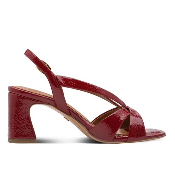 “Where sculptural heels meet fearless red.” Deze sandaaltjes zijn uitgevoerd in bloedrood imitatie lakleder, afgewerkt met een verstelbaar enkelbandje en een funky blokhak. * Sandaaltje * Blokhak * Imitatie lakleder * Verstelbaar enkelbandje * 'Touch it' binnenzool van echt leder! * Anti-slip zool en hak