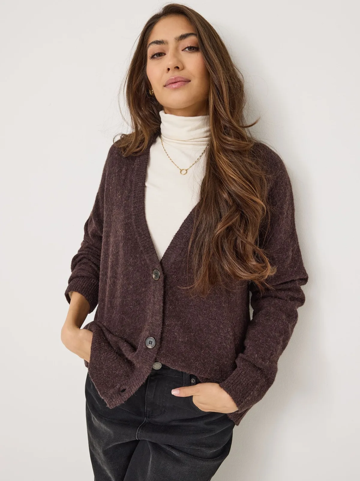 Design: Knop placket, Geribbeld gebreid, Knop sluiting; Type sluiting: Knoopsluiting; Halstype: V-hals; Motief: Effen; Extra's: Label patch/label flag, Label preegdruk; Pasvorm: Normale pasvorm; Armlengte: Lange mouw; Lengte: Normale lengte