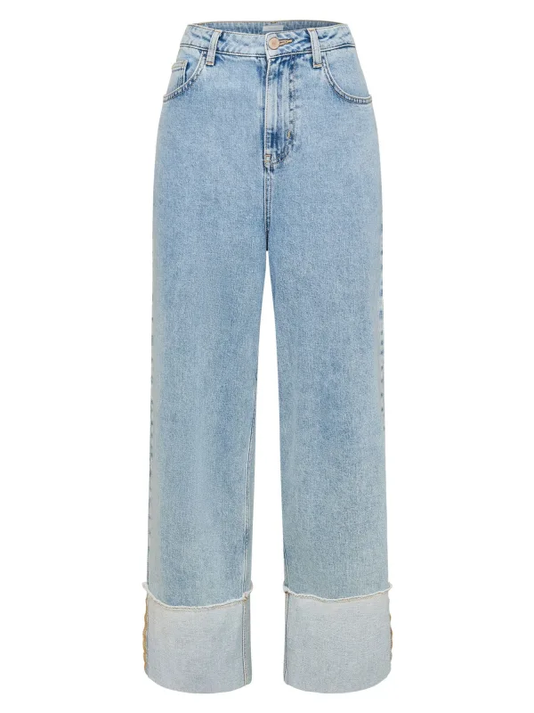 Design: Omgeslagen zoom; Type sluiting: Ritssluiting; Materiaal: Denim; Motief: Effen; Extra's: Vaste grip; Wassing: Light washed; Lengte: Lang/maxi; Pasvorm: Wide leg; Taillehoogte: Mid waist