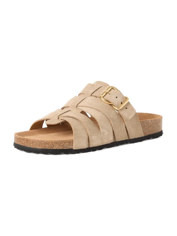 Design: Anatomisch gevormd voetbed, Profielzolen, Zool van kurk; Type sluiting: Slip; Materiaal: Leer; Motief: Effen; Materiaal: Suède; Schoenneus: Open toe; Extra's: Flexibele zool, Non-slip; Hakhoogte: Platte hak (0-3 cm)