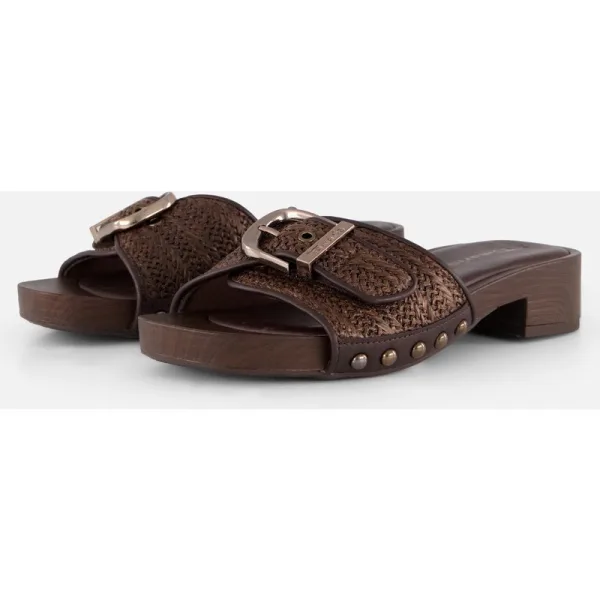Stijlvolle Tamaris slippers in een warme bruine tint, uitgevoerd in een hoogwaardige synthetische kwaliteit met een verfijnde, gevlochten look. Dit trendy model heeft een brede band met een decoratieve gesp, wat zorgt voor een modieuze en eigentijdse uitstraling. Dankzij het handige instapmodel trek je ze moeiteloos aan en uit, ideaal voor zomerse dagen. De comfortabele zool en subtiele hak geven extra ondersteuning, waardoor deze slippers perfect zijn voor zowel casual als iets gekledere outfits.
