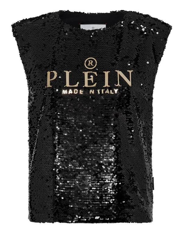 Verfraaid Een ontwerpdetail. Kijk hoe deze mouwloze top met pailletten in een nieuw jasje is gestoken. Het merk is aan de voorkant genaaid. Het heeft opvullingen om de schouderlijn te benadrukken.