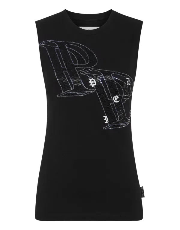 Verfraaid Innovatie en luxe zijn de belangrijkste elementen van dit mouwloze T-shirt. Kijk naar de details. Stretchkatoenen jersey Strass-monogramprint PP Hexagon op een saffiaanleren patch genaaid op het juk Ribgebreide hals Tweenaaldsstiksels
