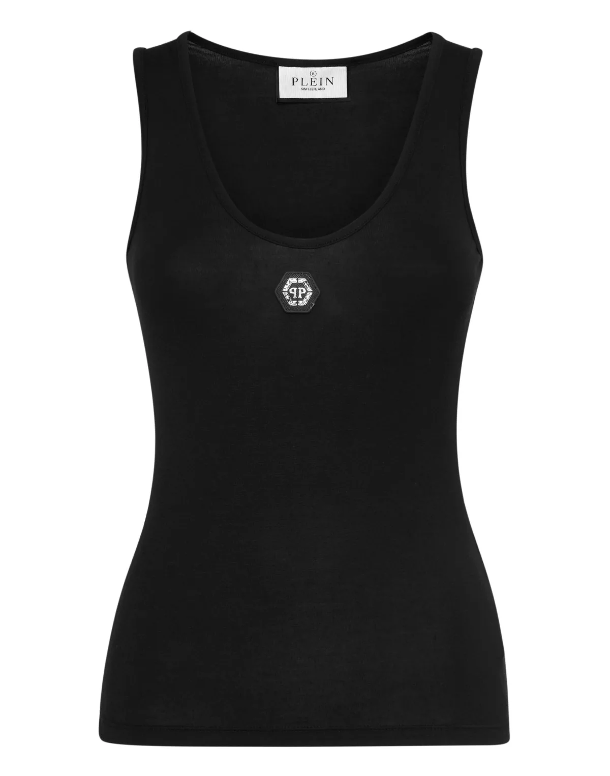 A design detail. See how this cotton blend jersey top is transformed. And there’s more. Cotton jersey Bejewelled PP Hexagon on the front PP Hexagon on a saffian leather patch sewn on the back Two needle stitching