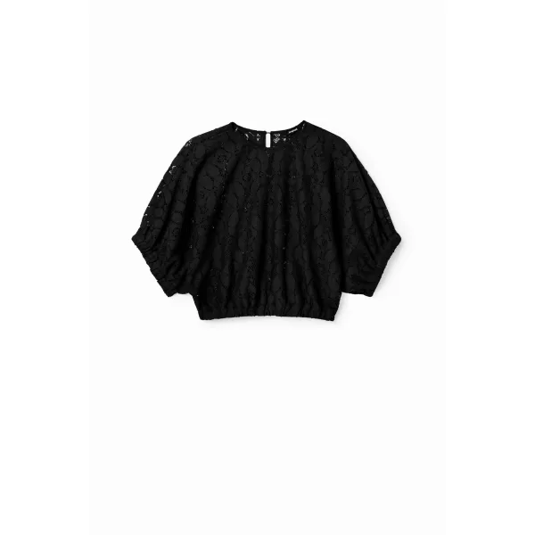 Korte, losse blouse met korte, gerimpelde vleermuismouwen en elastische onderkant, van gebloemd kant.Losse pasvormKorteRetro bloemenkantRonde halslijnKorte mouwenKnoopsluitingHalslijn achteraan met opening en knoopStretchrubber aan mouwen en onderkantDuurzame vezel: gerecycled polyester