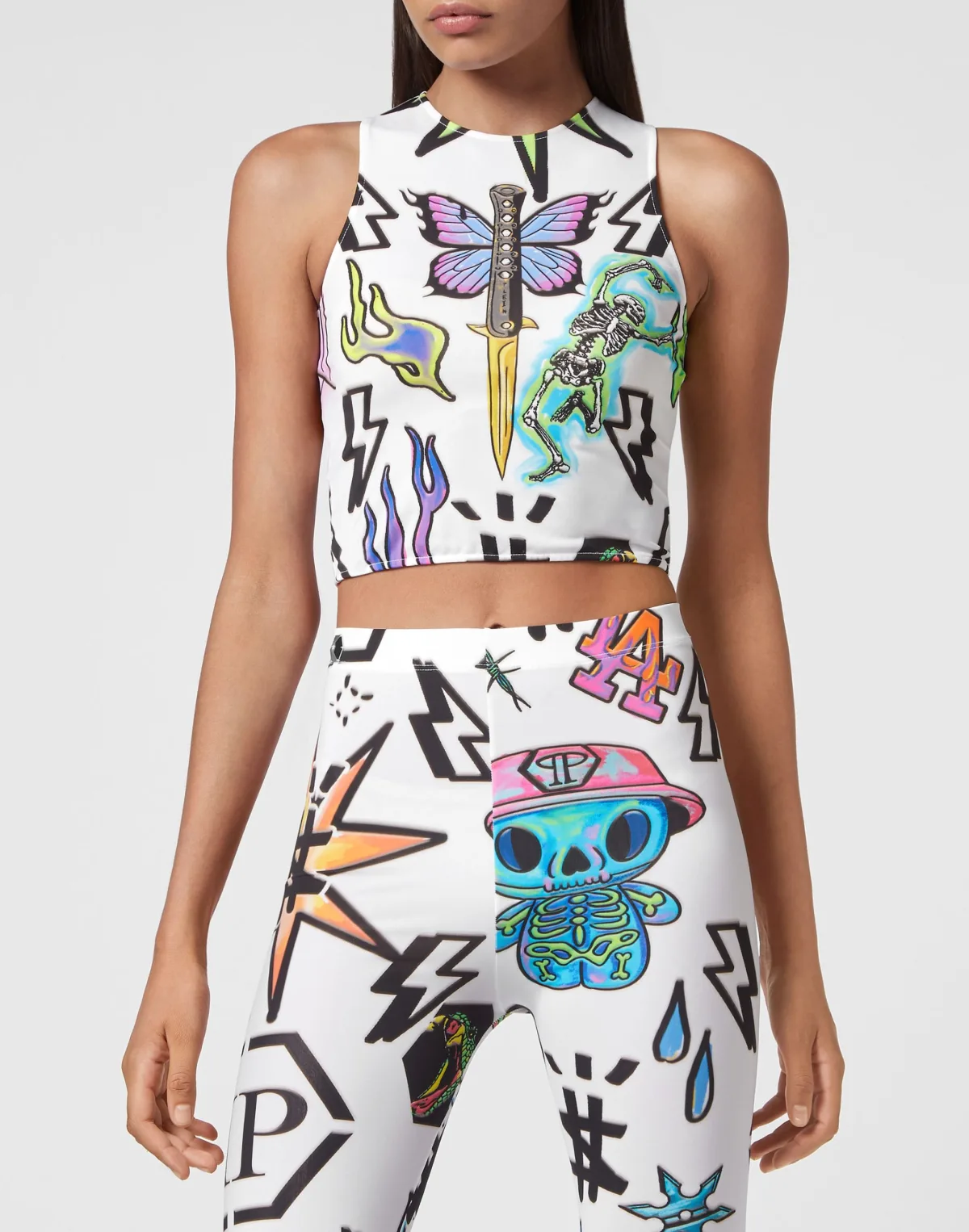 Monogram Tattoo-print stretch lycra mouwloze top. Stiksels met twee naalden.
