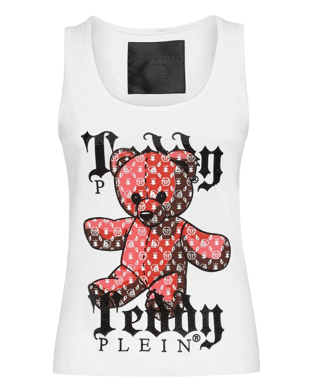 Tanktop van katoenen jersey met een met strass-steentjes versierde Teddybeerprint. Het zeshoekige logo is op het juk genaaid. Zomen gestikt met twee naalden.