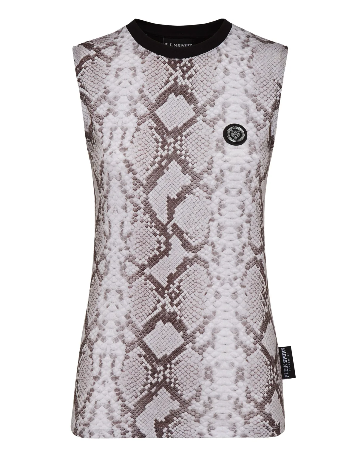 We ontwierpen dit mouwloze T-shirt dat prestaties en stijl combineert. Dit model is perfect voor buitensessies of trainingen in de sportschool. Maximaal comfort stretchkatoen Pythonprint Merkopdruk op de rug Rubberen Tiger patch opgenaaid op de linkerborst Ribgebreide hals Tweedraads gestikte zomen