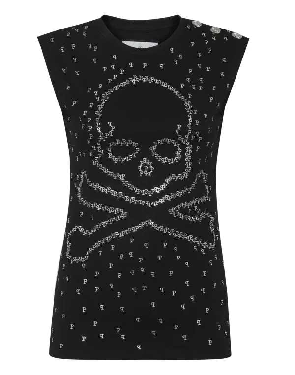 Verfraaid Een ontwerpdetail. Kijk hoe deze katoenen jersey mouwloze top is getransformeerd. En er is meer. Katoenen tricot Schmucksteinbesetzter Skull & Bones print op de voorkant Juwelknoopsluiting op de linkerschouder PP Hexagon Logo op een saffiaan lederen patch genaaid op het juk Ribgebreide hals Stiksels met twee naalden
