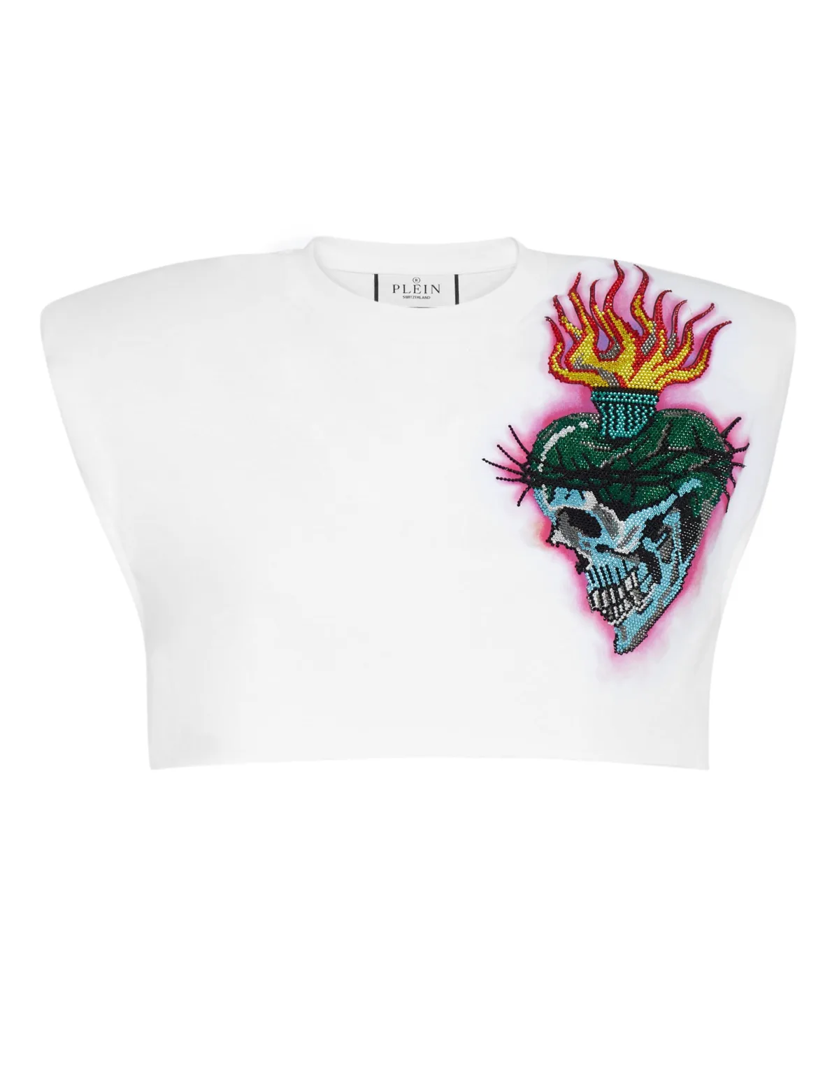 Een ontwerpdetail. Kijk hoe deze katoenen jersey mouwloze crop top is getransformeerd. En er is meer. Katoenen jersey Bejeweled Love Tattoo themaprint op voor- en achterkant Schoudervulling PP Hexagon op een saffiaanleren patch op het juk Zomen met ruwe snit