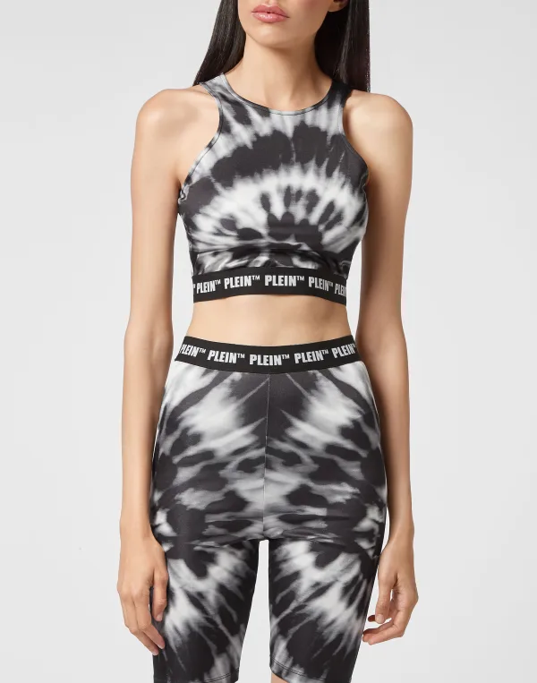 Gewatteerde top in stretch viscosemix met tie-dye print. Het logo is jacquard geweven op de elastische onderboord.