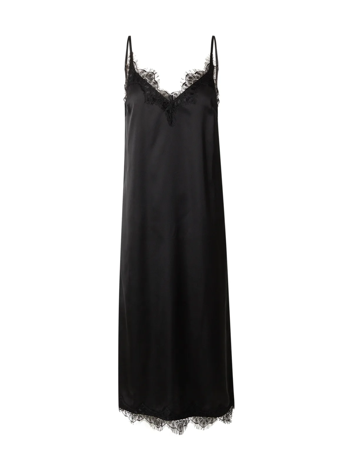 Design: Recht model; Type sluiting: Slip; Materiaal: Viscose; Halstype: V-hals; Motief: Effen; Soort bandjes: Spaghettibandjes; Details: Kant; Lengte: 3/4 lengte; Pasvorm: Losse pasvorm; Armlengte: Mouwloos