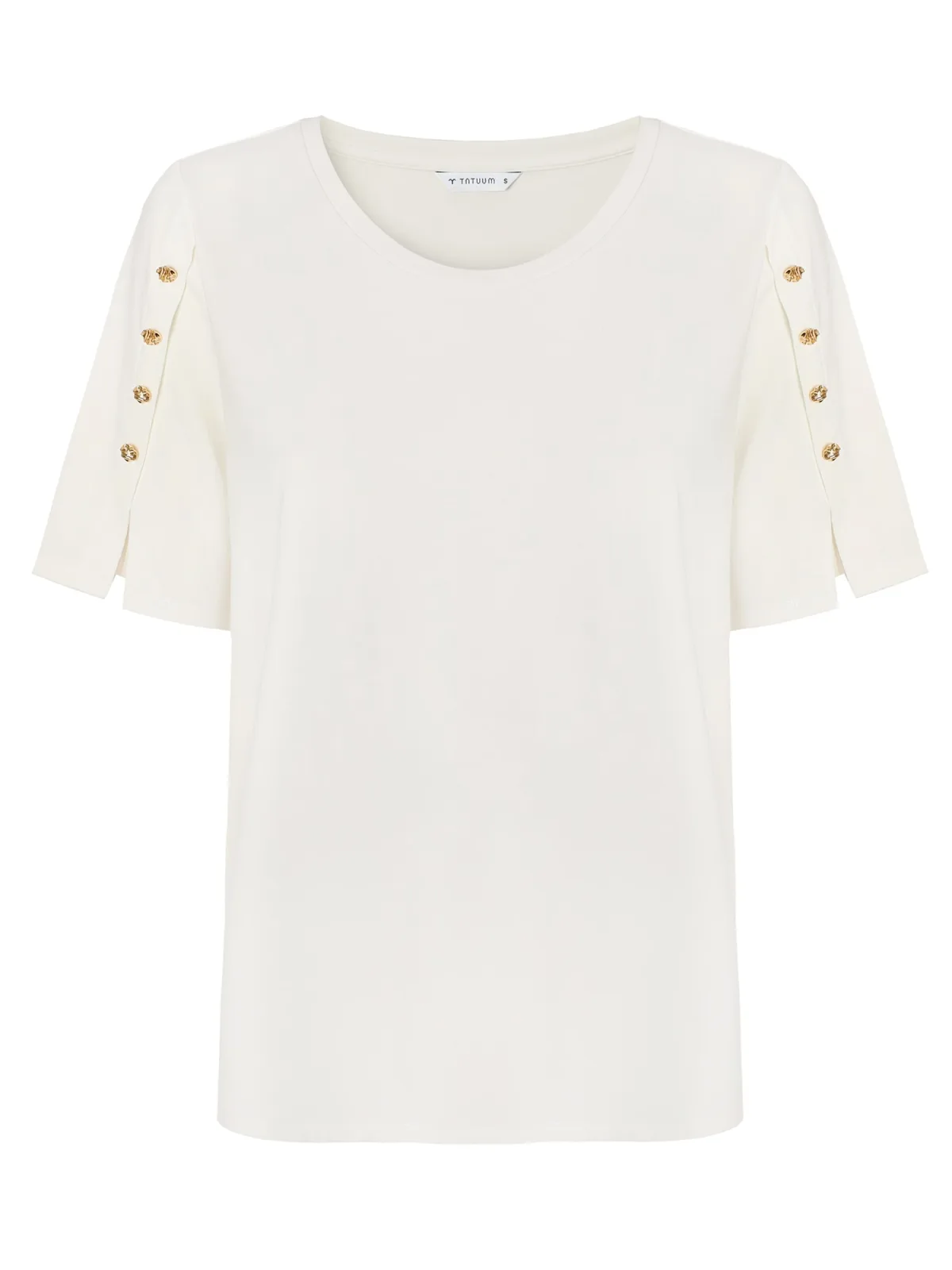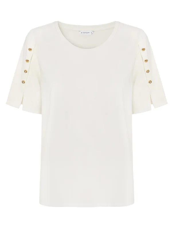 Deze elegante T-shirt blouse combineert een klassiek ontwerp met subtiele details.De korte mouwen zijn versierd met kleine knopen voor een elegante touch, terwijl de mix van modal en katoen uitzonderlijk comfort biedt gedurende de hele dag.De veelzijdige ronde hals maakt dit model de perfecte basis voor een verscheidenheid aan looks, van casual tot meer sophisticated.