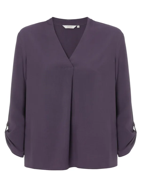 Blouse type: Wijde blouse; Design: 1-knoops manchetten, Gevoerde zoom/rand; Materiaal: Viscose; Motief: Effen; Kraag: Zonder kraag; Details: Plooien; Extra's: Op staal naden; Pasvorm: Losse pasvorm; Armlengte: Driekwart mouw; Lengte: Normale lengte