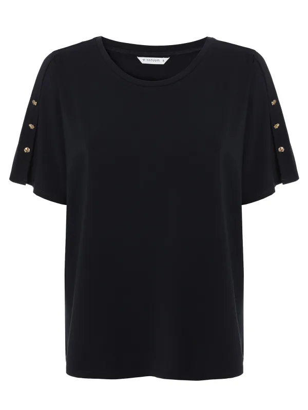 Deze elegante T-shirt blouse combineert een klassiek ontwerp met subtiele details.De korte mouwen zijn versierd met kleine knopen voor een elegante touch, terwijl de mix van modal en katoen uitzonderlijk comfort biedt gedurende de hele dag.De veelzijdige ronde hals maakt dit model de perfecte basis voor een verscheidenheid aan looks, van casual tot meer sophisticated.