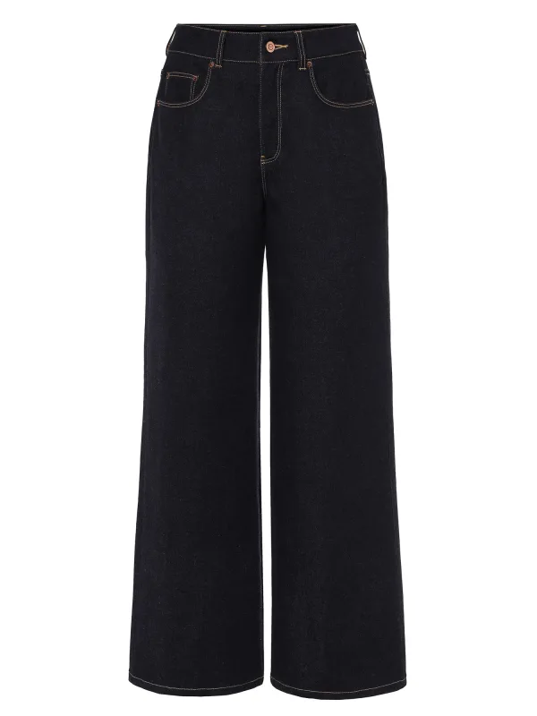 Design: Paspelzak; Type sluiting: Ritssluiting; Materiaal: Denim; Motief: Effen; Wassing: Rinsed/dark washed; Lengte: Lang/maxi; Pasvorm: Wide leg; Taillehoogte: High waist