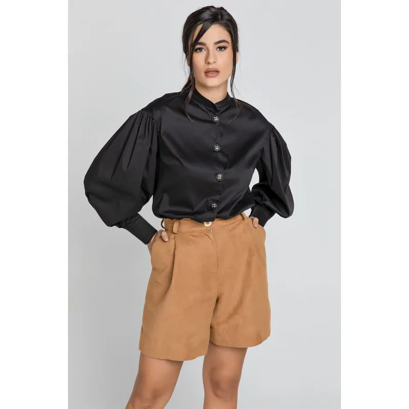 Taupe bermuda van imitatieleer. Tailleband met riemlussen. Twee zakken aan de zijkant en een faux zak aan de achterkant. Twee omgekeerde plooien aan de voorkant. Verborgen rits- en knoopsluiting aan de voorkant. Lengte: boven de knie. Ons model is 176cm en draagt maat 36/S. Afmetingen voor maat 36/S (in cm): Taille-32, Onderkant-50, Lichaamslengte(Binnen/Buitenkant)-45/17. Accessoires zijn niet inbegrepen. 100% polyester