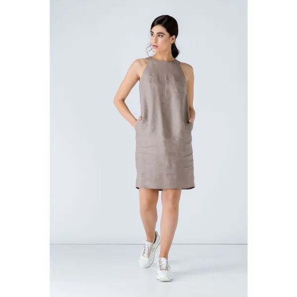 Zomerse zakjurk van taupe geweven linnen stof. Ronde hals en mouwloos. Darts op de borst en 2 steekzakken. Verborgen ritssluiting op de rug, toon op toon. Ons model is 172 cm en draagt maat 36/S. Afmetingen voor maat 36 (in cm): Schouder -28; Borst-45; Taille-50; Onderkant-52; Lichaamslengte-95. Losse pasvorm. 100% linnen