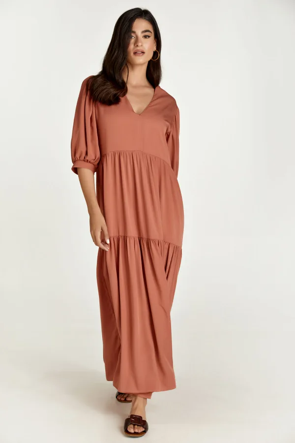 Deze terracotta maxi-jurk is gemaakt van cupro-stijl stof. Het model heeft elleboogpofmouwen met plooitjes op de schouders en manchetten. Het heeft een diepe V-halslijn. Er zit dubbele stof aan de bovenkant van de jurk voor een perfecte pasvorm. Er zijn twee verticale naden op het lijfje met plooitjes eronder voor een ruche-effect. De jurk heeft een ontspannen los silhouet.