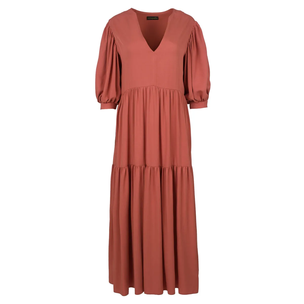 Deze terracotta maxi-jurk is gemaakt van cupro-stijl stof. Het model heeft elleboogpofmouwen met plooitjes op de schouders en manchetten. Het heeft een diepe V-halslijn. Er zit dubbele stof aan de bovenkant van de jurk voor een perfecte pasvorm. Er zijn twee verticale naden op het lijfje met plooitjes eronder voor een ruche-effect. De jurk heeft een ontspannen los silhouet.