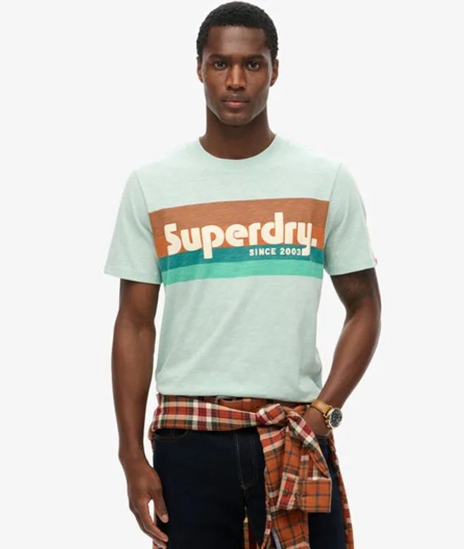 Relaxte pasvorm - de klassieke Superdry-pasvorm. Niet te nauwsluitend, niet te ruim, precies goed. Kies je gebruikelijke maat Geribde ronde hals Opgedrukte grafische tekst op de borst Kenmerkend label op de mouw Laat dit seizoen je eigen stijl op de best mogelijke manier zien met ons Terrain gestreept T-shirt met relaxte pasvorm en logo. Dit shirt heeft een getextureerde tekstprint op de borst en biedt de perfecte balans tussen retro en klassieke mode. De opvallende print maakt het dan weer heel