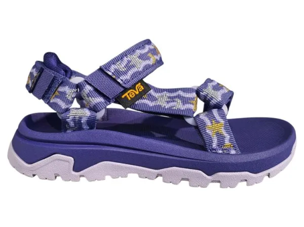Soepele en waterbestendige sandaal model Hurricane XLT JR van het merk Teva met een 3 voudige klittenband sluiting in de kleur paars met golf print. Kleurcode SRPL starlight purple. De pasvorm is normaal maar valt één maat groter uit. Dus bestel een maat kleiner.