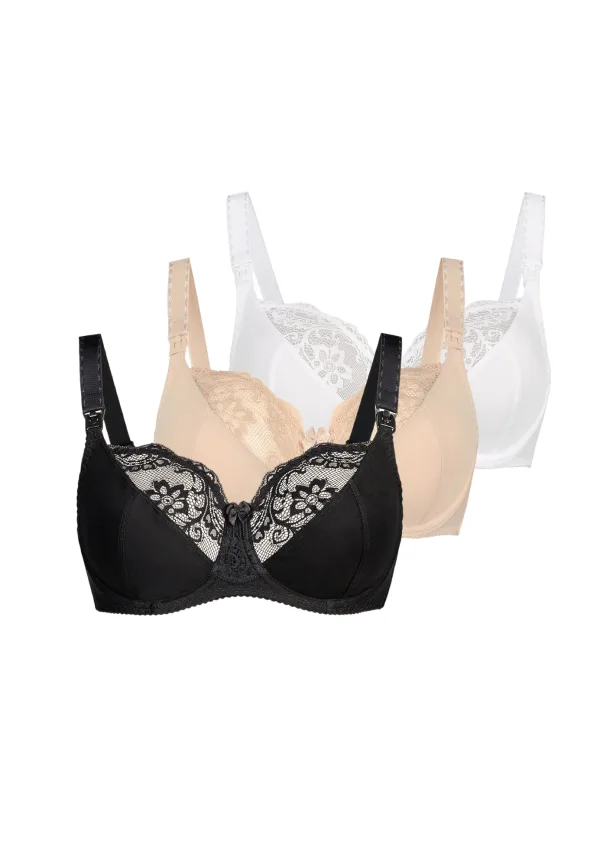 Cup soorten: Soft cup bh; Soort bandjes: Verwijderbare bandjes; Bh/bikini type: Minimizer; Beugel: Met beugel; Type sluiting: Haakjes; Materiaal: Katoen; Motief: Effen; Details: Kant; Extra's: Verstelbare bandjes; Borstvoedingsfunctie: Met borstvoedingsfunctie; Aantal: 3 Pack