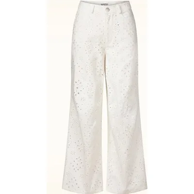 “A little countryside in every stitch.” Deze jeans heeft rechte, wijde pijpen, een klassiek 5-pocket design en is uitgevoerd in een stevige, non-stretchy 100% katoen broderie in wit. * 5 pocket jeans * Hoge taille * Rits- en knoopsluiting voorzijde * Riemlussen * Rechte, wijde pijen