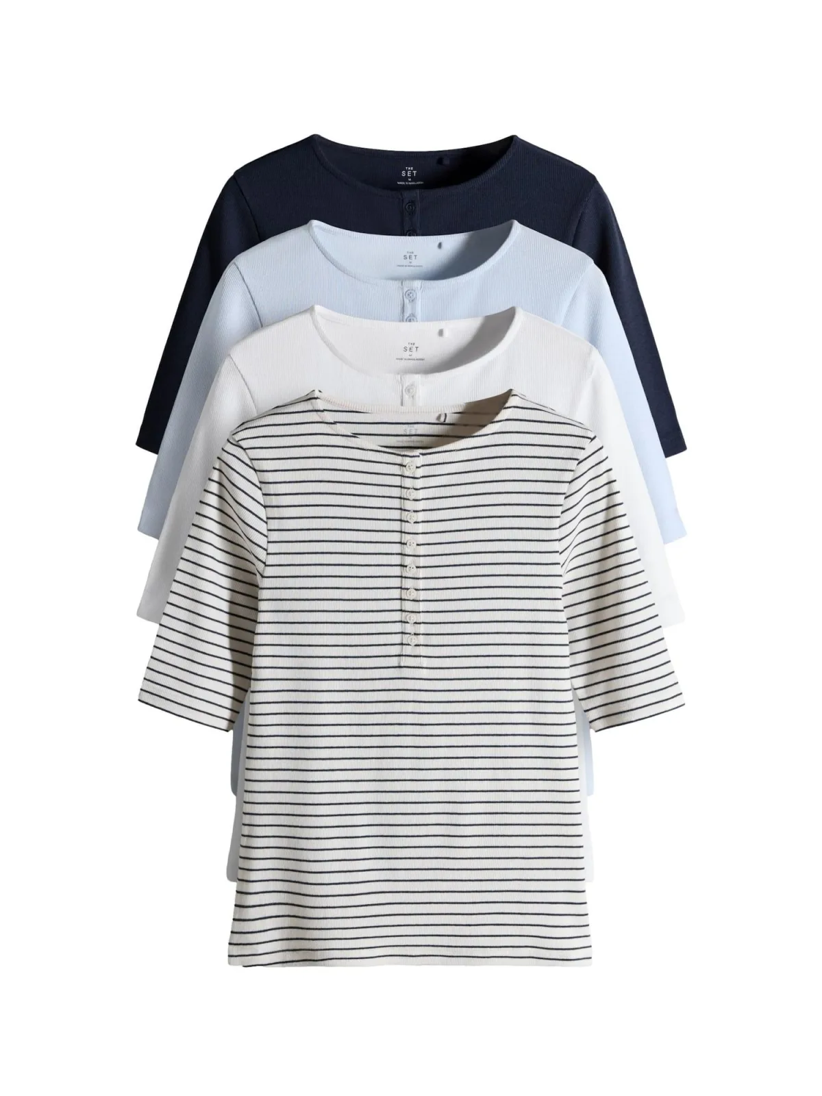 Design: Gevoerde zoom/rand, Drukknopen, Rechte zoom, Geribbeld gebreid; Type sluiting: Knoopsluiting; Materiaal: Jersey; Halstype: Henley hals; Extra's: Met textuur, Voelt zacht aan; Pasvorm: Normale pasvorm; Aantal: 4 Pack; Armlengte: Kwartmouw; Lengte: Normale lengte