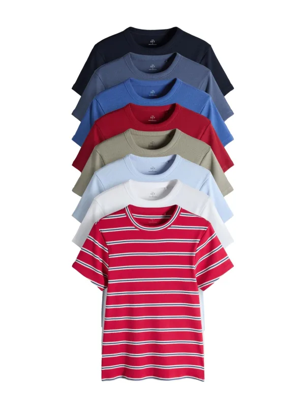Design: Gevoerde zoom/rand; Materiaal: Jersey; Halstype: Ronde hals; Motief: Gestreept; Extra's: Voelt zacht aan; Pasvorm: Normale pasvorm; Aantal: 8 Pack; Armlengte: Kwartmouw; Lengte: Normale lengte