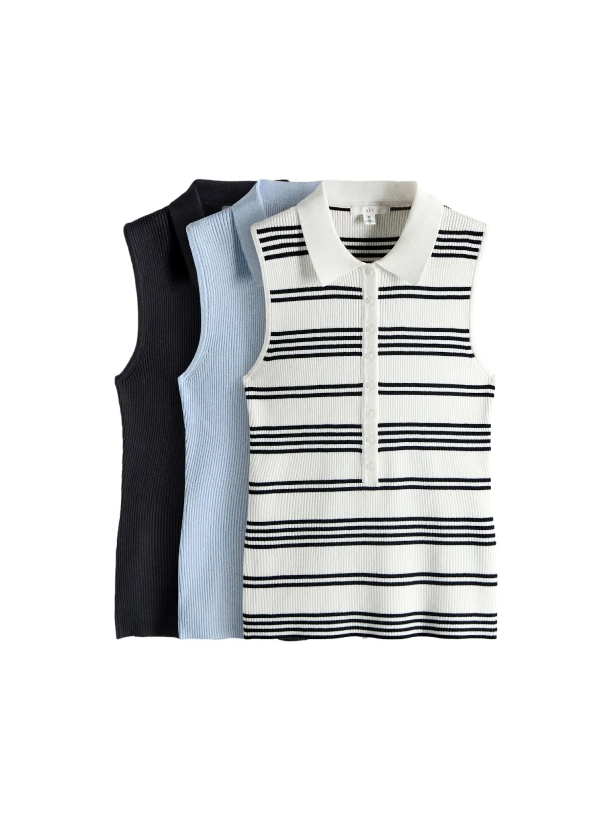 Design: Geribbelde kraag, Geribbeld gebreid; Materiaal: Jersey; Halstype: Polokraag; Motief: Gestreept; Soort bandjes: Brede bandjes; Extra's: Fully fashioned, Met textuur; Pasvorm: Normale pasvorm; Aantal: 3 Pack; Armlengte: Mouwloos; Lengte: Normale lengte