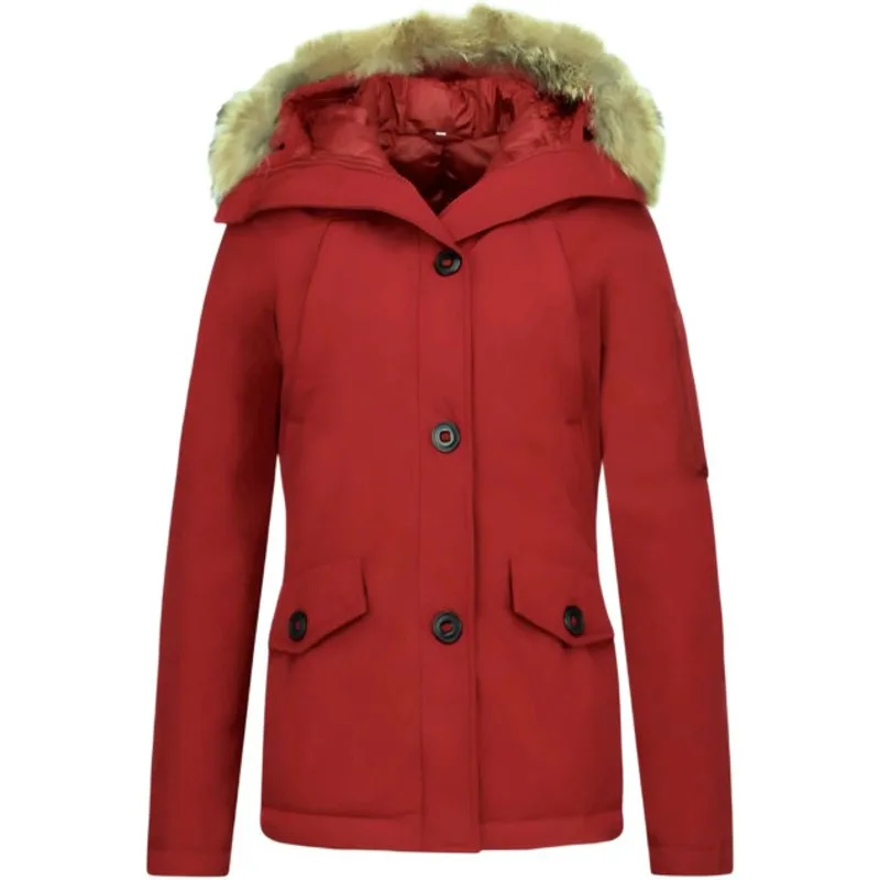 Winterjassen - Dames Winterjas Canada Kort - Bontkraag - Rood - Specificaties:- Dames Winterjas - Dames Winter Parka- Lengte: Kort- Pasvorm: Normaal - Sluiting: Rits met knopen- Materiaal: Polyester- Voering: 70% Polyester 30% Katoen- Lichaam voering: 100% Polyester- Zakken: 2 Jaszakken, Géén binnenzak- Seizoen: Winter- Capuchon: Niet afritsbaar- Standaard Bontkraag: GROOT - Bontkraag: Afhaalbaar- Wasvoorschrift: Machinewas 30 graden / Stomerij- Beschikbare Maten: S - M - L - XL - XXL Let op: De bontkraag is een natuurproduct en hierdoor heeft ieder stuk bont zijn eigen unieke uitvoering. Het bont kan dus afwijken in volheid van vacht en in kleur dan op de afbeelding weergegeven.