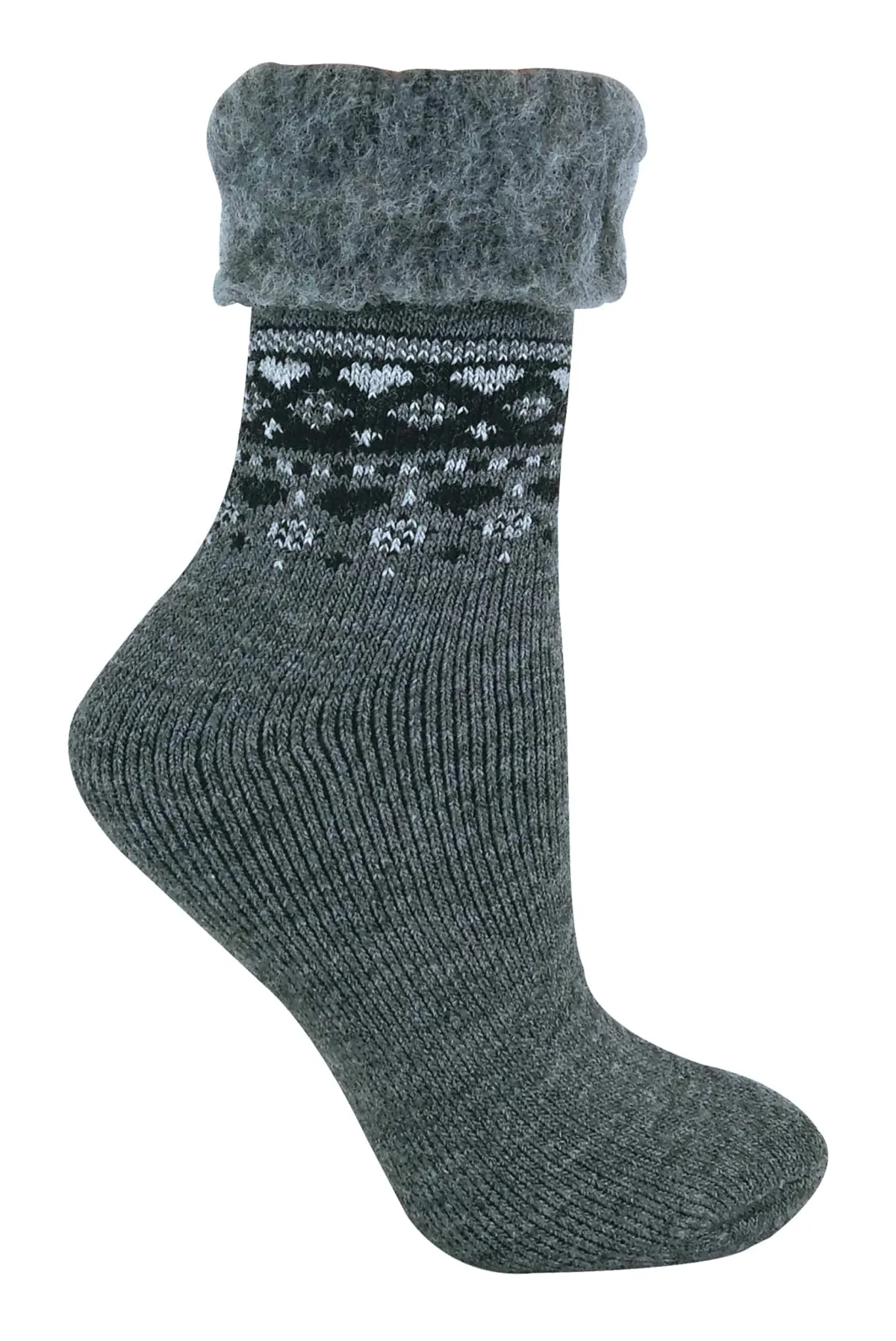 Onze stijlvolle wollen omslagsokken voor dames zijn de ideale aanvulling op de garderobe van elke stijlvolle vrouw die waarde hecht aan zowel warmte als comfort. Met deze sokken-omslagbovenkant - het is ideaal om te dragen met korte slofjes voor een stijlvolle look voor overdag. Als alternatief kan deze sok ook worden gecombineerd met uw meest comfortabele loungekleding, en kan hij worden gedragen terwijl u ontspant om de voeten thuis comfortabel en warm te houden. Deze sokken hebben een zacht geborstelde binnenkant, waardoor de sok zacht en pluizig is. Deze geborstelde binnenkant helpt ook om warmte dichter bij de huid te houden, waardoor deze sok ongelooflijk behaaglijk is voor een nachtje binnen of als je naar buiten gaat tijdens de wintermaanden. Met een stijlvolle fairisle print aan de buitenkant van de sokken zijn deze sokken perfect voor ieders wintergarderobe. Verkrijgbaar in 5 verschillende kleuren, deze sokken zijn maat 37-42 EU en zijn het perfecte cadeau voor je voeten! Deze sokken zijn gemaakt van 63% acryl, 24% wol, 12% polyamide, 1% elastaan en zijn machinewasbaar.