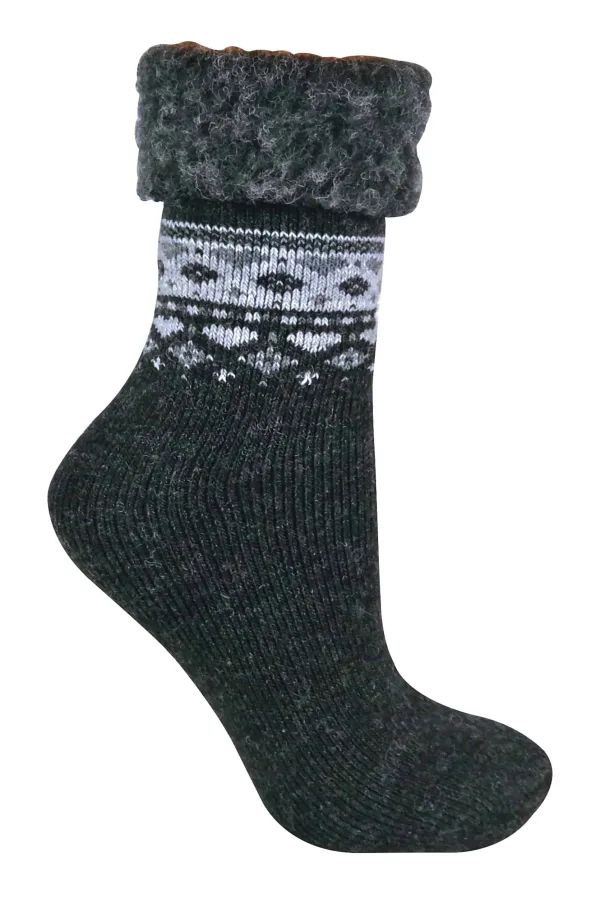 Onze stijlvolle wollen omslagsokken voor dames zijn de ideale aanvulling op de garderobe van elke stijlvolle vrouw die waarde hecht aan zowel warmte als comfort. Met deze sokken-omslagbovenkant - het is ideaal om te dragen met korte slofjes voor een stijlvolle look voor overdag. Als alternatief kan deze sok ook worden gecombineerd met uw meest comfortabele loungekleding, en kan hij worden gedragen terwijl u ontspant om de voeten thuis comfortabel en warm te houden. Deze sokken hebben een zacht geborstelde binnenkant, waardoor de sok zacht en pluizig is. Deze geborstelde binnenkant helpt ook om warmte dichter bij de huid te houden, waardoor deze sok ongelooflijk behaaglijk is voor een nachtje binnen of als je naar buiten gaat tijdens de wintermaanden. Met een stijlvolle fairisle print aan de buitenkant van de sokken zijn deze sokken perfect voor ieders wintergarderobe. Verkrijgbaar in 5 verschillende kleuren, deze sokken zijn maat 37-42 EU en zijn het perfecte cadeau voor je voeten! Deze sokken zijn gemaakt van 63% acryl, 24% wol, 12% polyamide, 1% elastaan en zijn machinewasbaar.