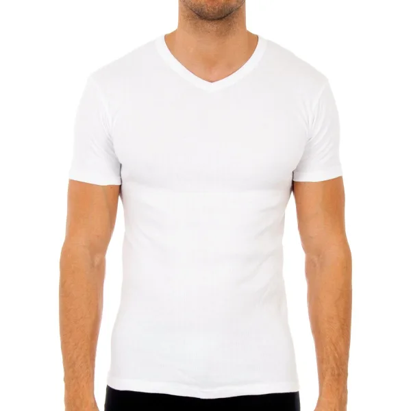 Thermisch T-shirt. Korte mouwen. V-hals met geribde afwerking. Stof met streepjesprint, zeer zacht en comfortabel. Kledingstuk dat perfect aansluit op het lichaam. Samenstelling: 100% katoen Onderhoud: Handwas op max. temperatuur. 40º. Geen bleekmiddel gebruiken. Droger is niet toegestaan. Strijken op max. temperatuur. 130º. Niet chemisch reinigen.