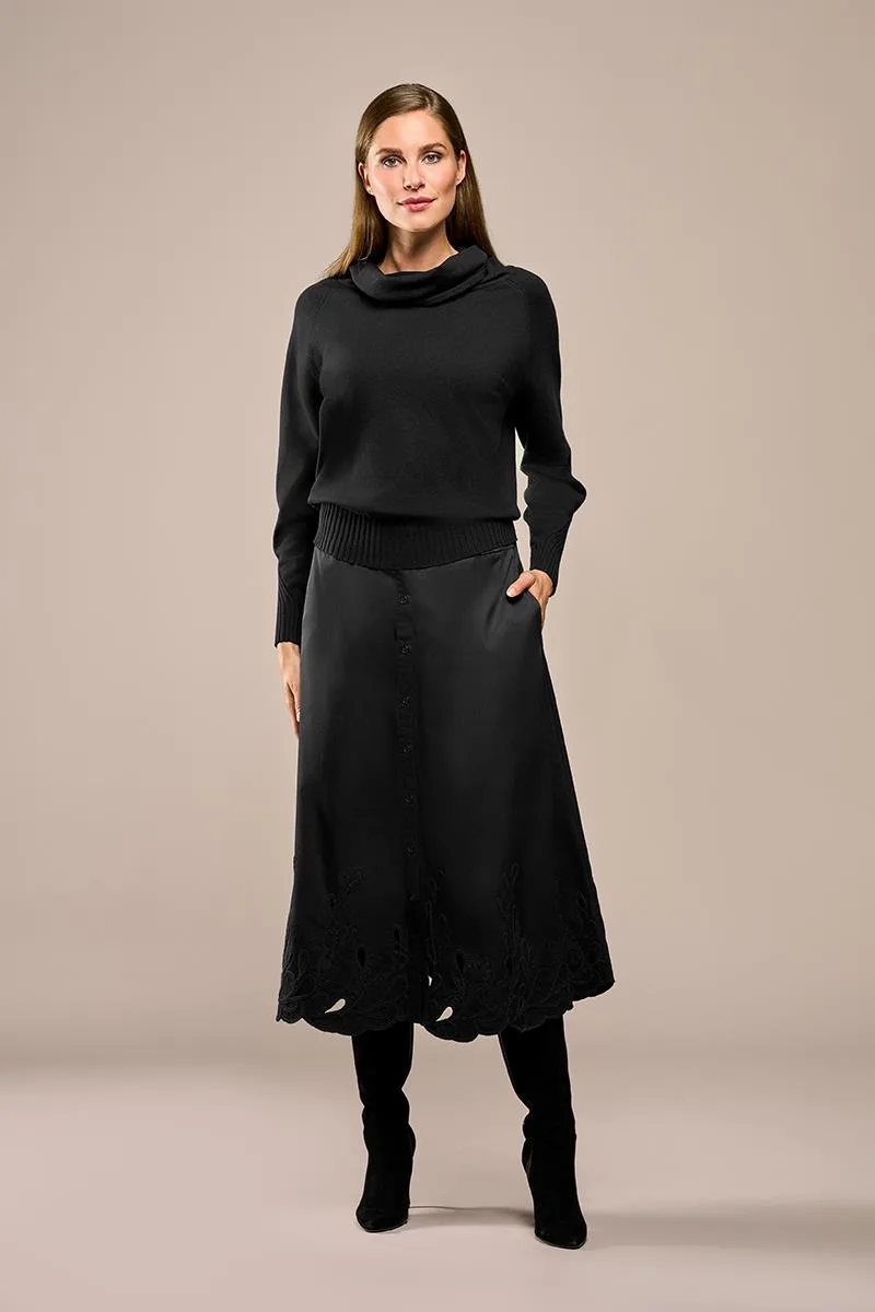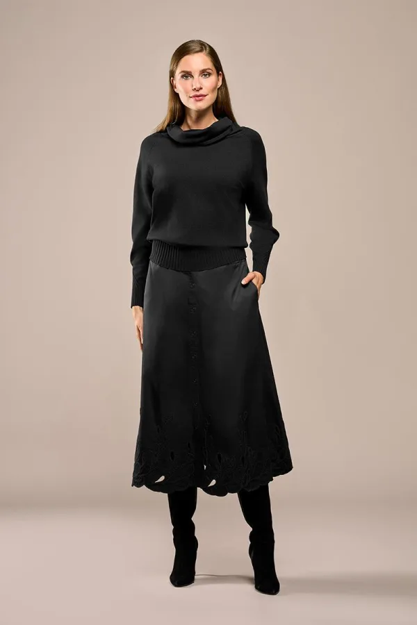 De Therry rok in een klassieke zwarte tint is een must-have voor de modebewuste vrouw die op zoek is naar een combinatie van elegantie en veelzijdigheid. De subtiele borduursels langs de zoom voegen een verfijnd accent toe, waardoor de rok een speelse maar toch chique uitstraling krijgt. Dankzij de doorknoopsluiting aan de voorkant en de elastische tailleband aan de achterkant biedt de rok zowel een modieus als comfortabel draagcomfort. Het flatterende A-lijn silhouet en de kuitlengte zorgen voor een prachtige pasvorm bij ieder figuur, terwijl het ademende materiaal ervoor zorgt dat je je de hele dag comfortabel voelt. Gemaakt van een hoogwaardige mix van polyester en katoen en gevoerd met 100% viscose, is deze rok licht en luchtig. De tijdloze zwarte kleur maakt hem geschikt voor elk seizoen, waardoor je hem moeiteloos kunt stylen voor zowel warme zomerdagen als koelere maanden.