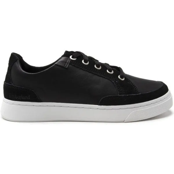 Zwarte Timberland Atlanta Green-sneakers met veters voor kinderen, gemaakt van bovenwerk van premium leer met details van suède panelen. zilveren oogjes en subtiele branding. Deze sneakers in tennisstijl hebben een stevige witte rubberen buitenzool en een loopvlak met merknaam voor comfort en uithardbaarheid.