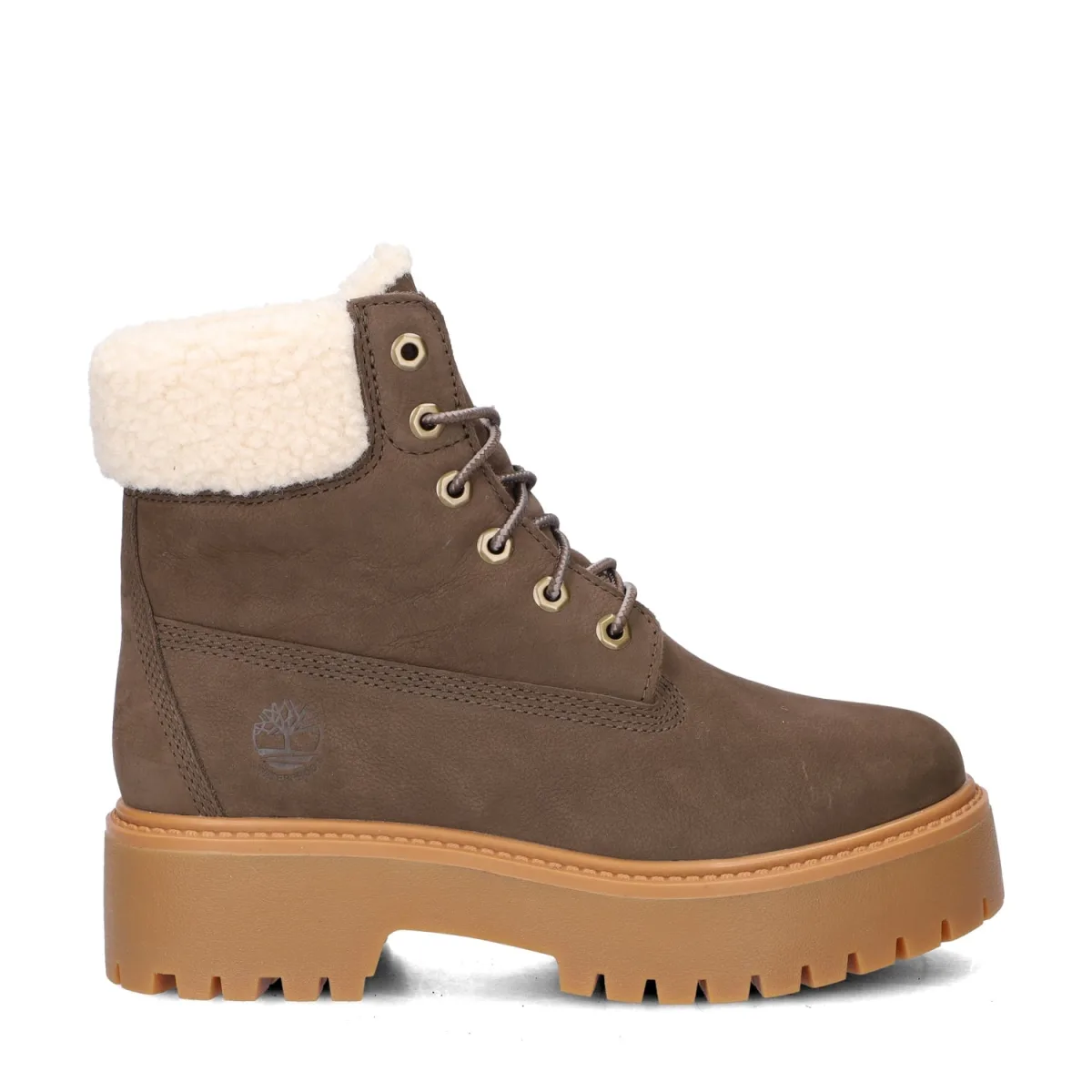 Timberland Stone Street dames veterboot De veterboots van Timberland zijn inmiddels een fenomeen onder de schoenen en iedereen zou een exemplaar in de kast moeten hebben. Uitgevoerd in duurzaam geproduceerd nubuckleer wat erkend is om zijn verantwoorde productiemethode. Deze soepele leersoort is comfortabel en vormt zich om de voet. Gevoerd met teddy-stof gemaakt van Timberlands ReBOTL-textiel wat voor minstens 50% bestaat uit gerecycled plastic. Ook het voetbed is bekleed met dezelfde teddystof wat warmte goed vast houdt en koude voeten voorkomt. Afgewerkt met een stevige plateauzool met grof profiel om grip en stabiliteit te garanderen bij iedere stap.