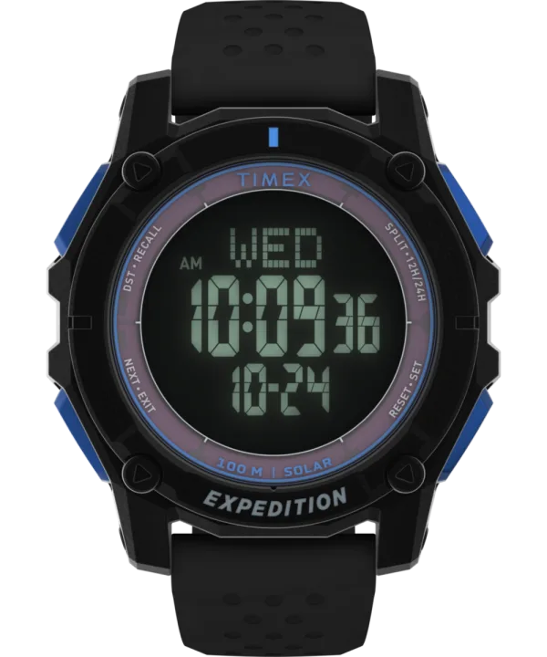 Dit Timex Expedition North Ridge digitale horloge voor heren is het perfecte sieraad om te dragen of als cadeau te geven. De zwarte 49 mm ronde kast in combinatie met de comfortabele zwarte silicone horlogeband zorgt ervoor dat je optimaal van dit schitterende horloge kunt genieten zonder enige concessies. Aangedreven door een hoogwaardige quartz-gebruikersbeweging en waterdicht tot 10 bar, blijft je horloge tikken. Ervaar het ultieme in functionaliteit voor buitenactiviteiten. Dit digitale horloge heeft een kalenderfunctie: dag-datum, evenals zonne-energie, stopwatch, countdown, wereldtijd en alarm. Hoogwaardige band van 21 cm lang en 21 mm breed, met een gespsluiting. Kastdiameter: 49 mm, kastdikte: 12 mm, kastkleur: zwart en wijzerplaatkleur: zwart.