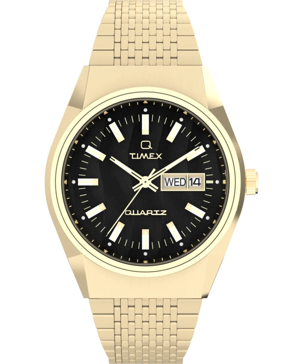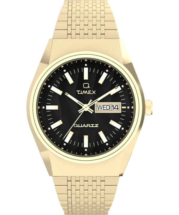 Deze Timex Falcon Eye Analoge Horloge voor Heren is het perfecte uurwerk om te dragen of cadeau te geven. De gouden 38 mm ronde kast in combinatie met de comfortabele gouden roestvrijstalen horlogeband zorgt ervoor dat je volop kunt genieten van dit prachtige uurwerk zonder enig compromis. Aangedreven door een hoogwaardig kwartsuurwerk en waterbestendig tot 5 bar, blijft je horloge tikken. Volgend op de Q Timex 1979 heruitgave, voegt onze Q Timex Falcon Eye verfijning toe aan onze Q Timex-serie. Dit analoge horloge heeft een kalenderfunctie: Dag-Datum, evenals luminescerende wijzers en luminescerende cijfers. Hoogwaardige 21 cm lengte en 19 mm breedte van een gouden roestvrijstalen band met een vouwsluiting. Kastdiameter: 38 mm, kastdikte: 12 mm, kastkleur: goud en wijzerplaatkleur: zwart.