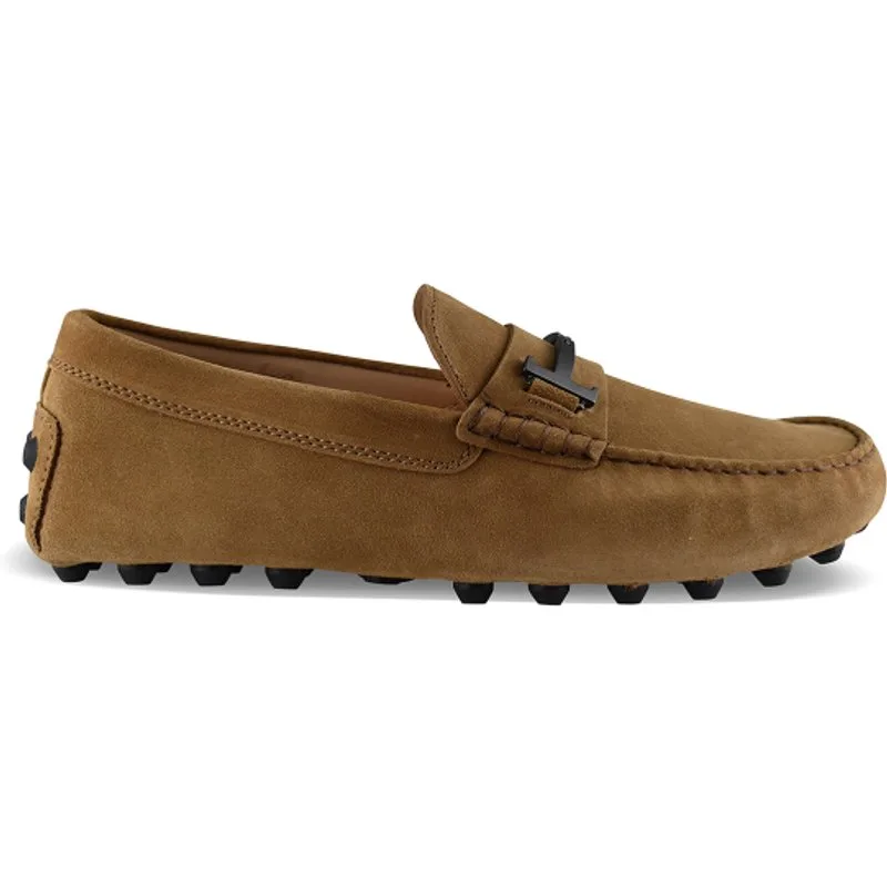 Bruine suède loafers van Tod's. Antraciet metalen studs aan de voorkant. Zwarte rubberen antislipnoppen.Zichtbare stiksels.Slip-on model.Afgeronde neus.Made in Italy.