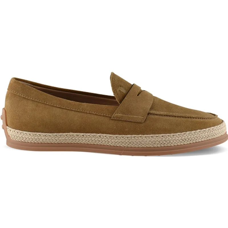 Tod's herenloafers in camelbruin suède.Bandje van suède aan de voorkant met het kenmerkende T-logo in reliëf op de voorkant.Rubberen zool met reliëfdetails.Raffia-rand.Made in Italy.