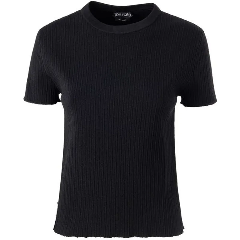 Tom Ford Stretch Ribbed Sweater. In het zwart, cropped met een ruwe snit aan de onderkant, korte mouwen, slim. Samenstelling: 72% Zijde, 15% Polyester, 13% Polyamide. Merk SKU: MAK1250YAX567 LB999 Interne SKU: 25AP23