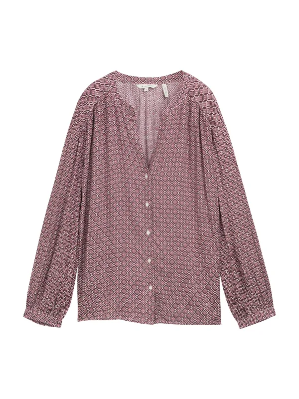 Blouse type: Klassieke blouse; Design: Gevoerde zoom/rand, Knop placket, Overcut schouder; Type sluiting: Knoopsluiting; Materiaal: Viscose; Kraag: Tuniek kraag; Details: Gedrapeerd; Extra’s: All-over patroon, Koele grip; Pasvorm: Losse pasvorm; Armlengte: Lange mouw; Lengte: Normale lengte